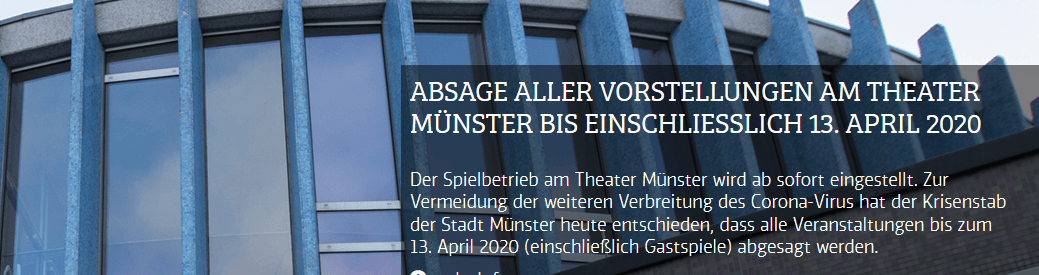 Der Spielbetrieb am Theater Münster wird ab sofort eingestellt. Zur Vermeidung der weiteren Verbreitung des Corona-Virus hat der Krisenstab der Stadt Münster heute entschieden, dass alle Veranstaltungen bis zum 13. April 2020 (einschließlich Gastspiele) abgesagt werden.